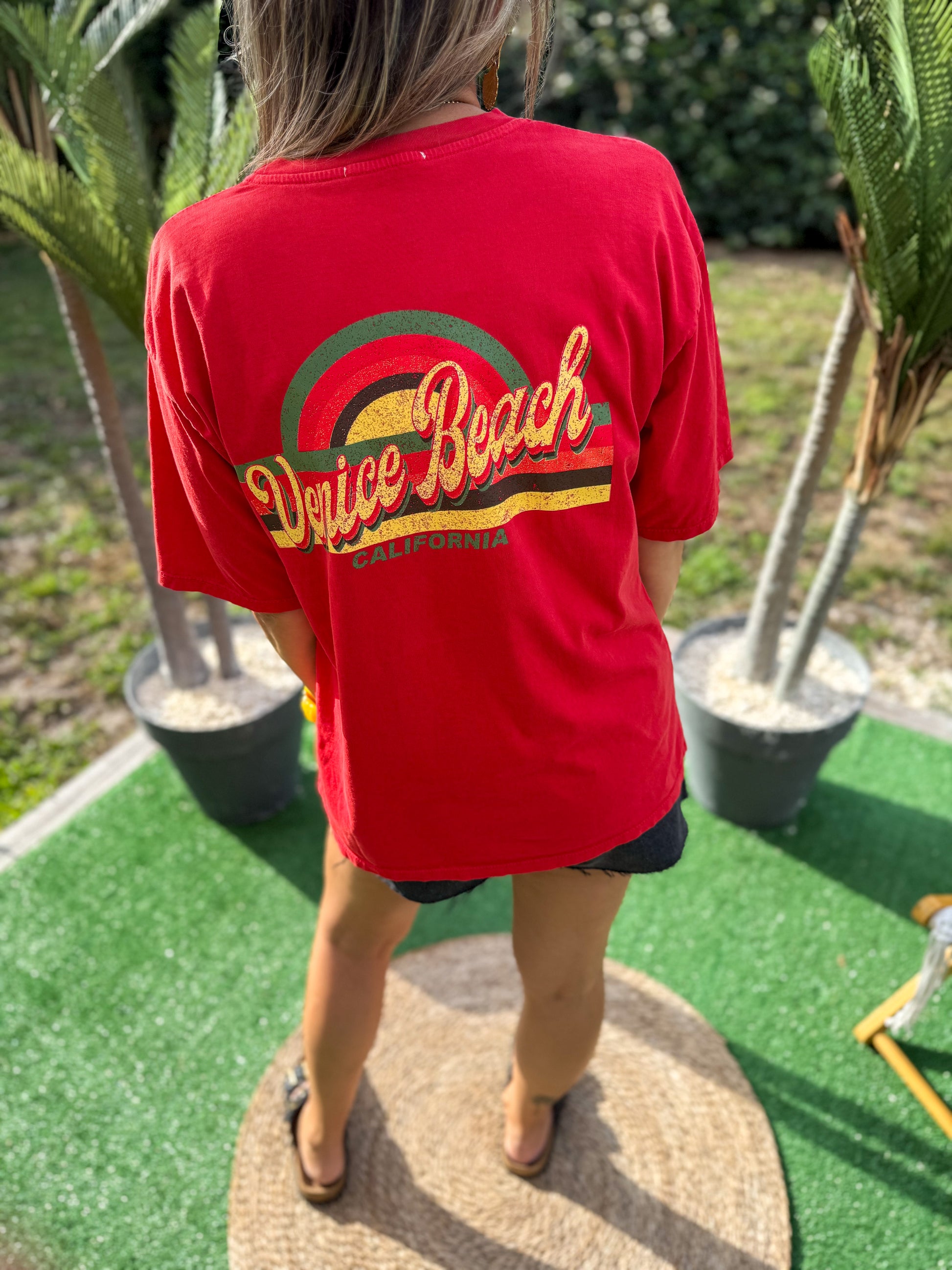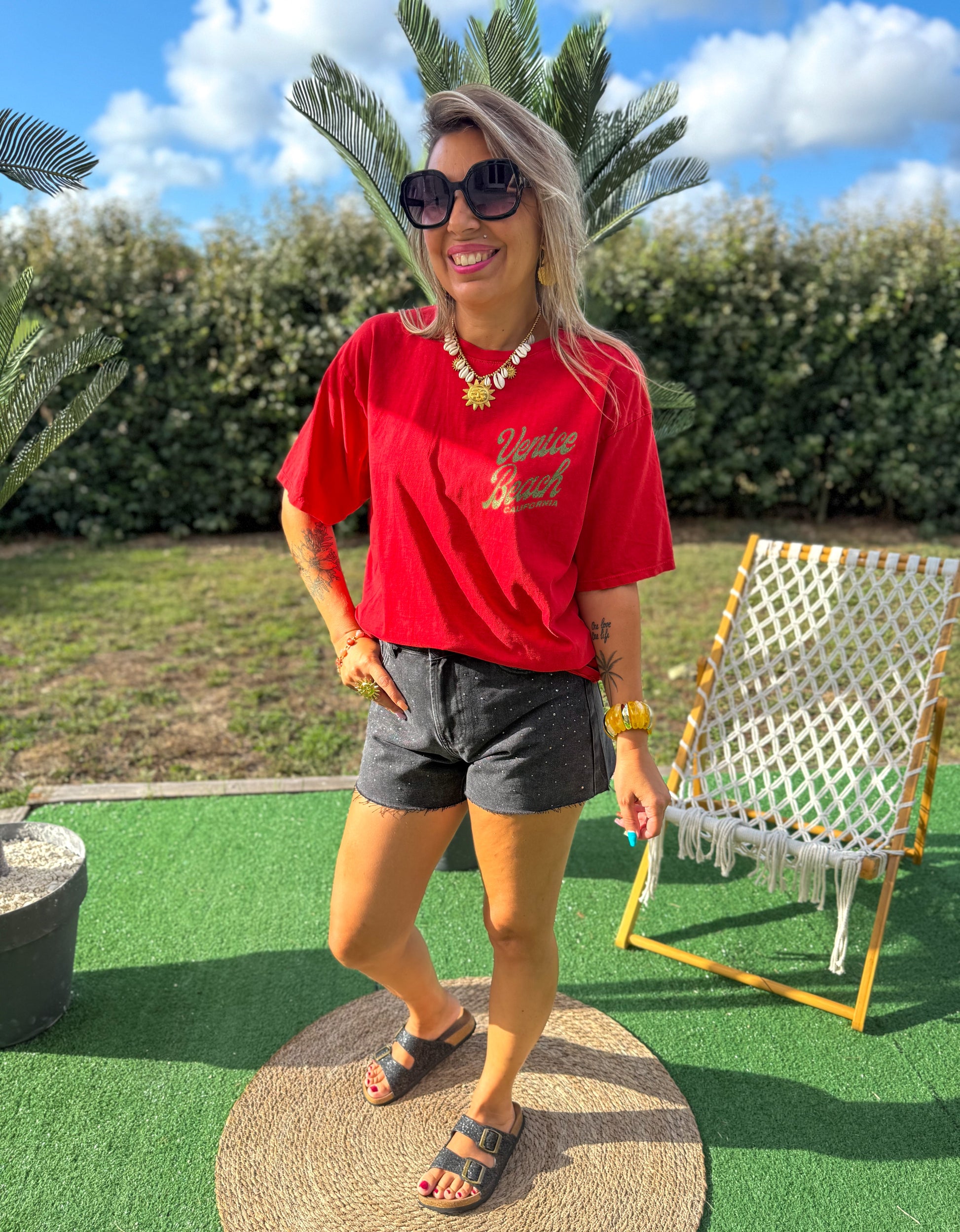 Cap sur la Californie avec ce t-shirt oversize ultra confort et stylé ! On craque pour sa couleur rouge et ses inscriptions “Venice Beach” à l’avant et à l’arrière, façon vintage pour un look 100 % good vibes. Son coton doux et sa coupe loose en font un allié parfait pour les journées ensoleillées, en bord de mer ou en ville.