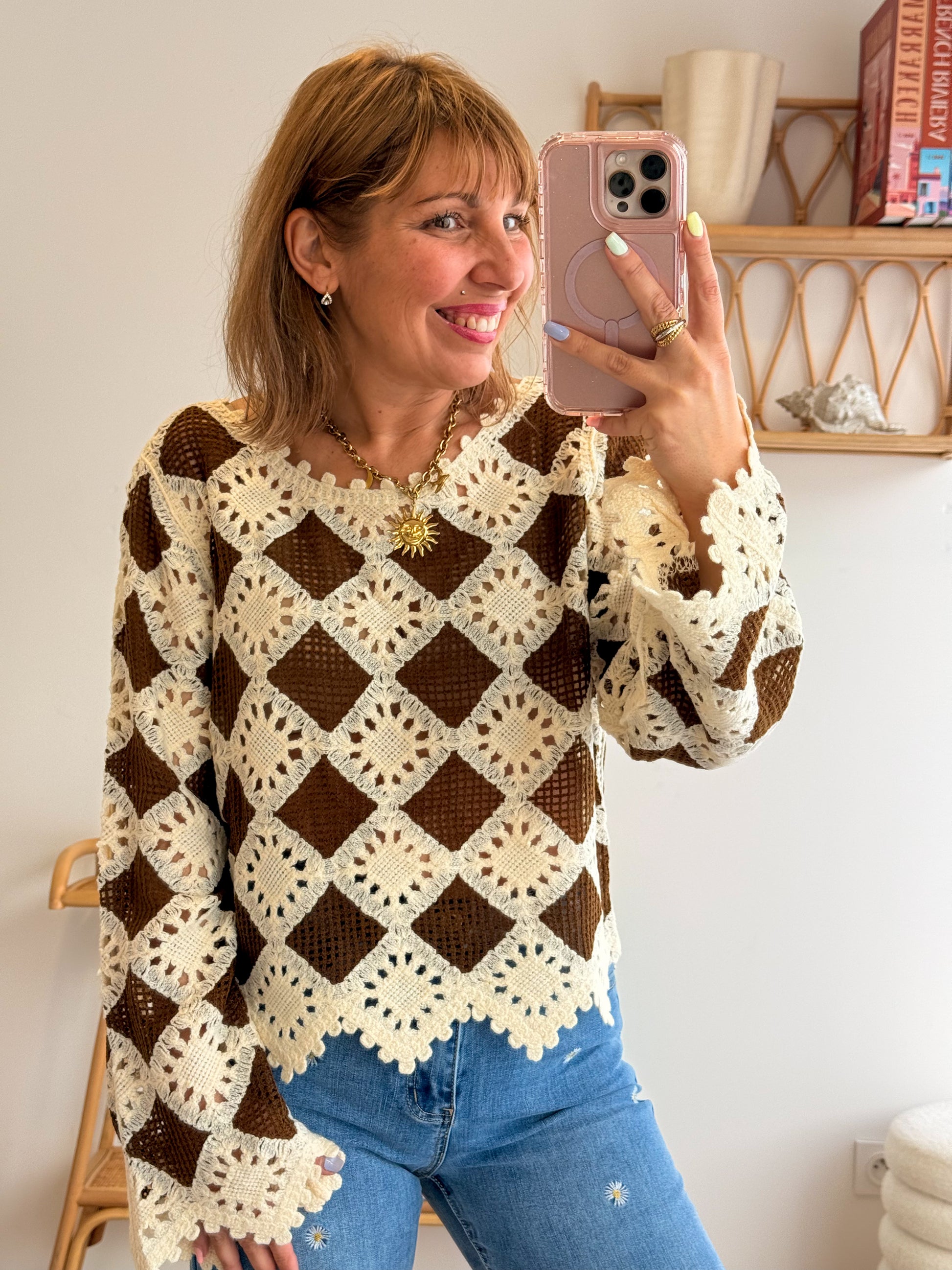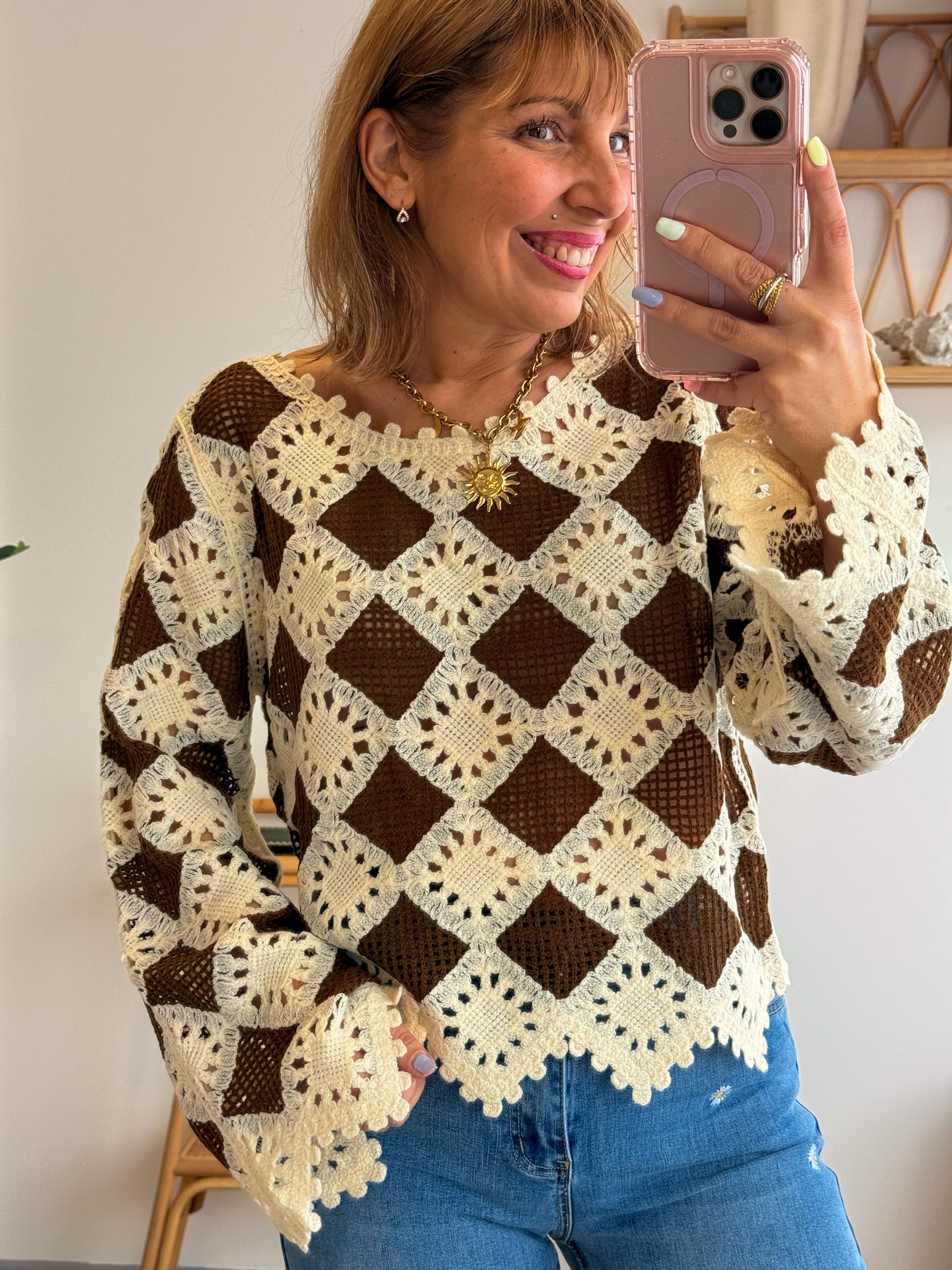 Coup de cœur assuré pour ce top bohème au crochet ajouré, aussi stylé que confortable. Son jeu de motifs géométriques écru et chocolat lui donne un charme fou, très solaire et ultra tendance.