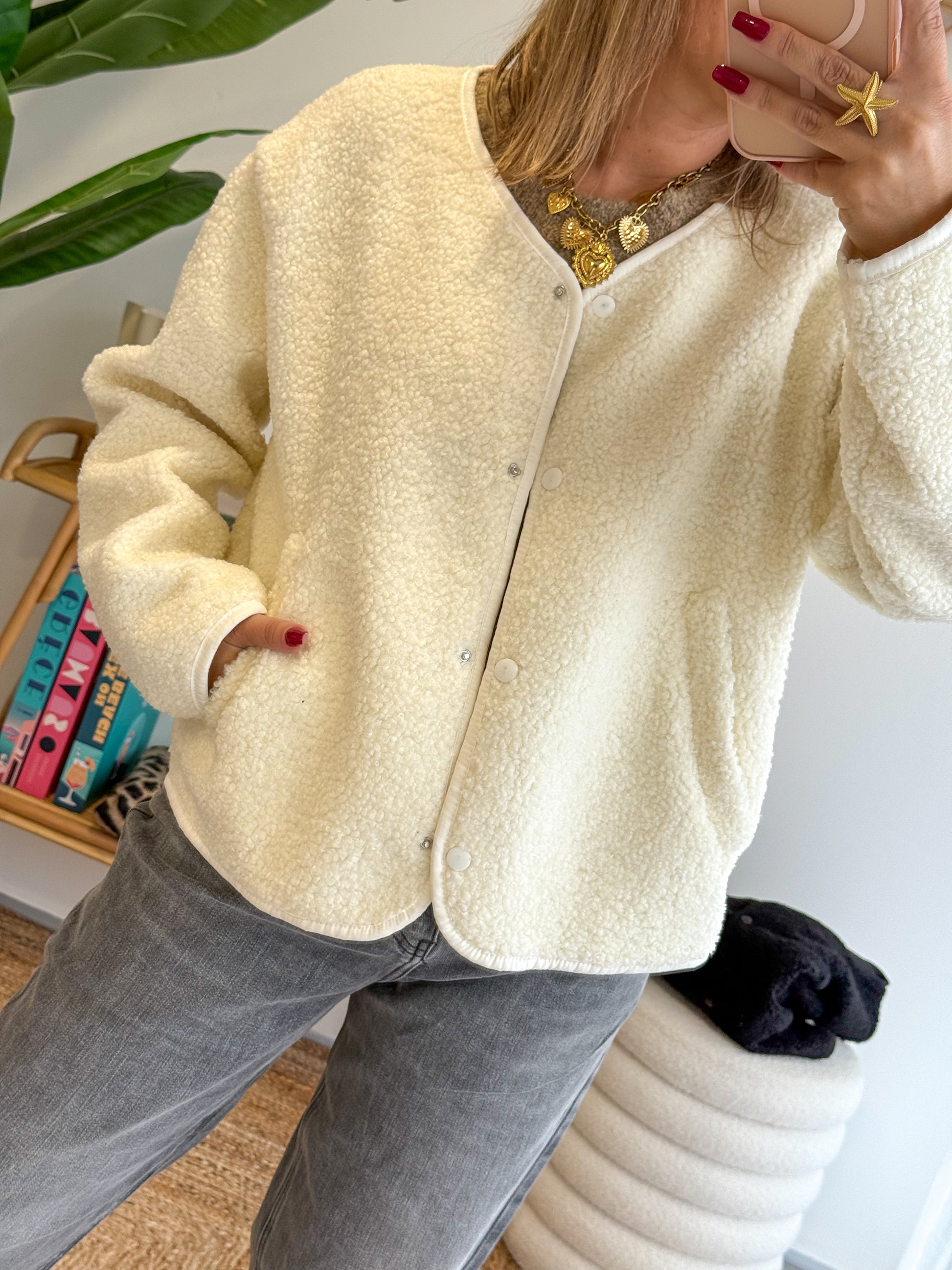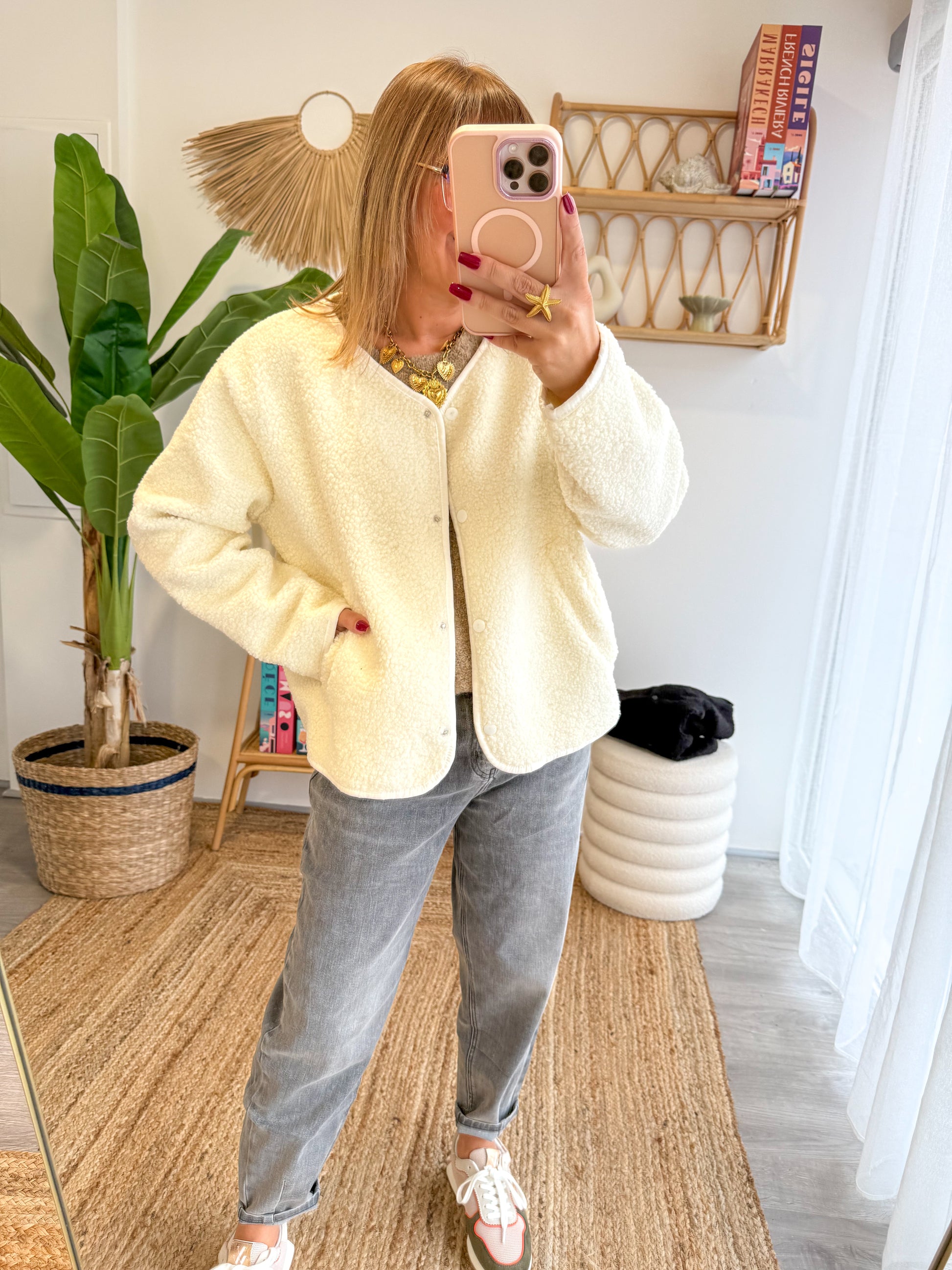 La veste FLUFFY est la pièce cocooning par excellence. Confectionnée dans une matière effet mouton toute douce, elle allie confort et tendance pour affronter les journées fraîches avec style. Sa coupe droite et son coloris écru lumineux en font un basique facile à associer et ultra cosy.