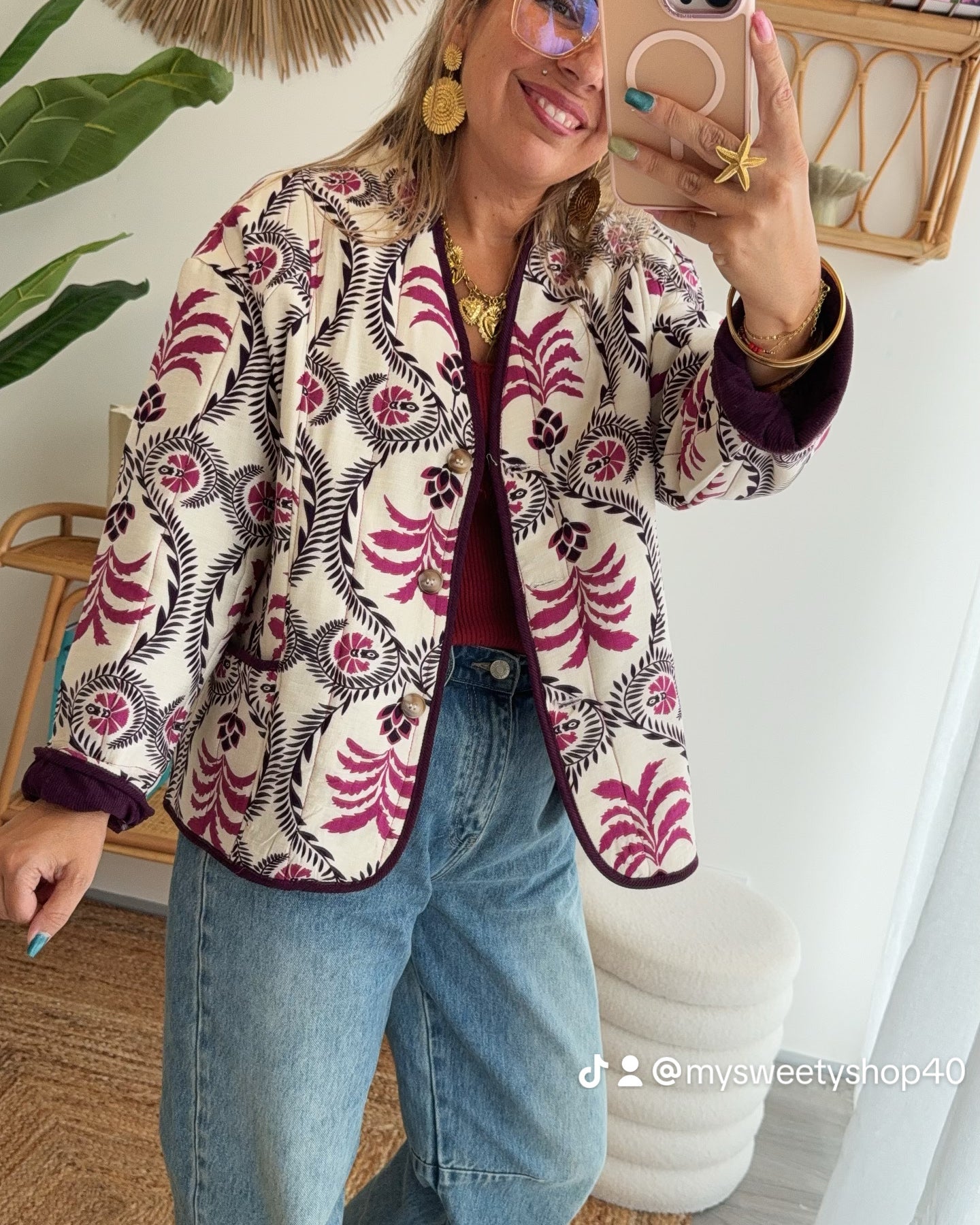 Avec son imprimé floral bordeaux et fuchsia sur fond écru, elle attire tous les regards tout en restant élégante. Sa coupe droite et légèrement ample assure un confort optimal, tandis que ses finitions contrastées en bordeaux foncé structurent la silhouette.