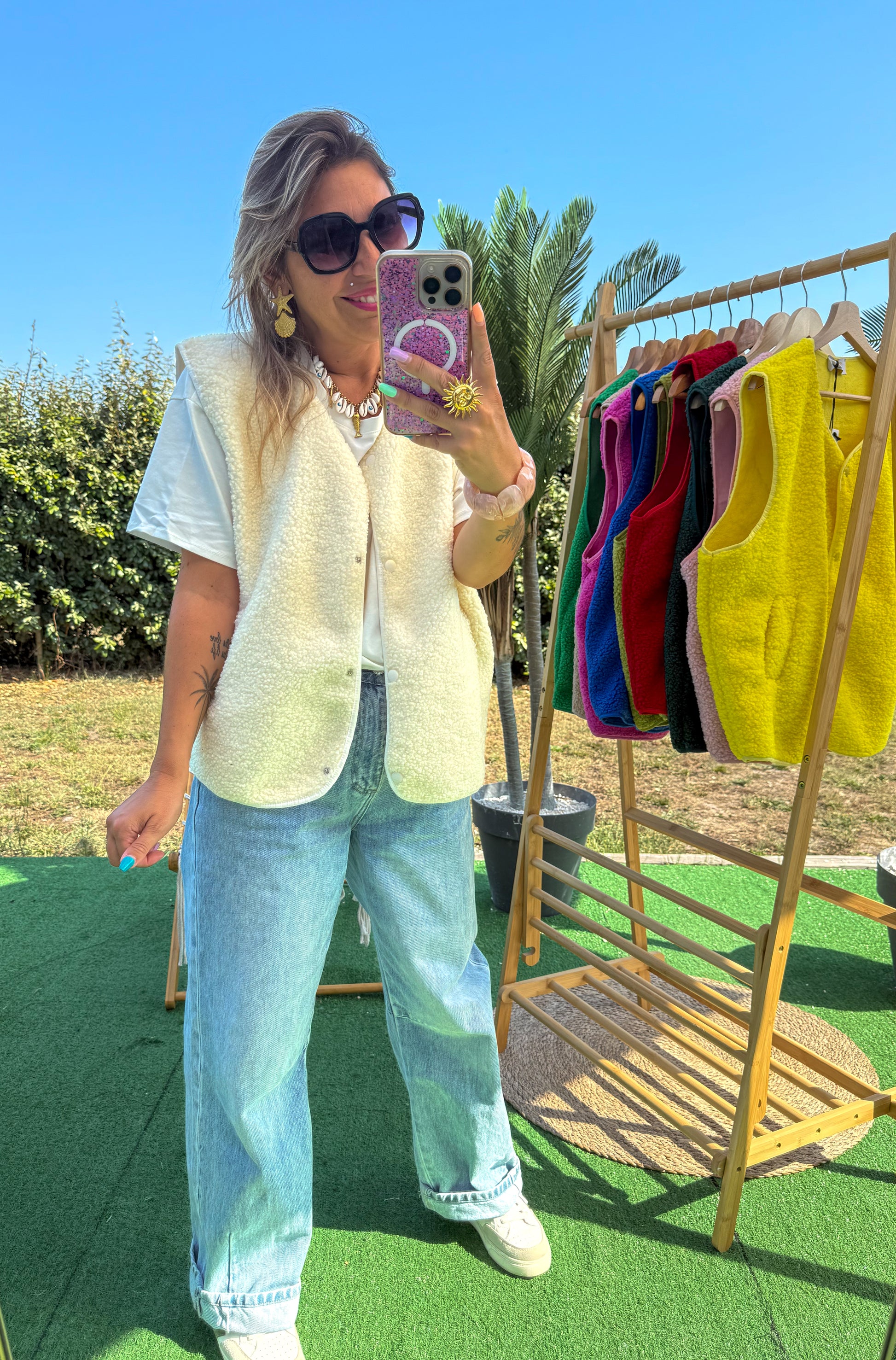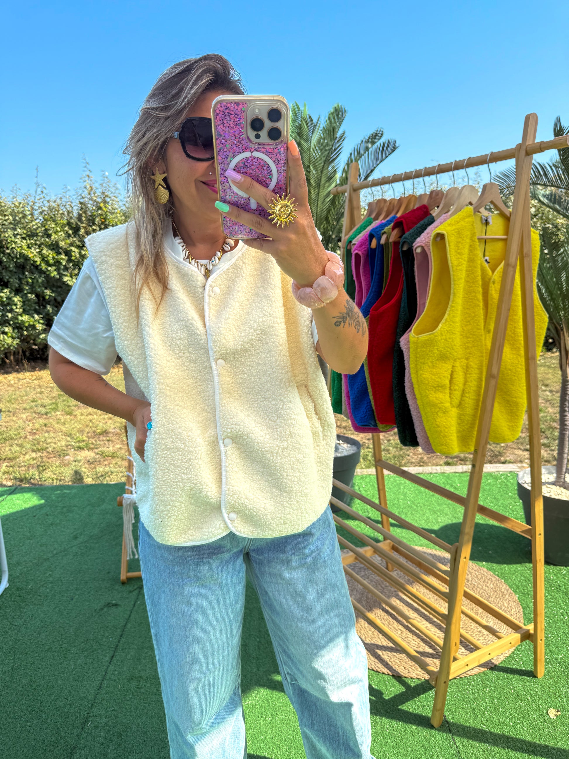 Un indispensable de mi-saison ! Ce gilet sans manches en matière effet teddy ultra douce apporte une touche pop et cosy à toutes vos tenues. On craque pour sa couleur écru , son col en V et sa coupe légèrement ample, idéale pour un look décontracté mais tendance.