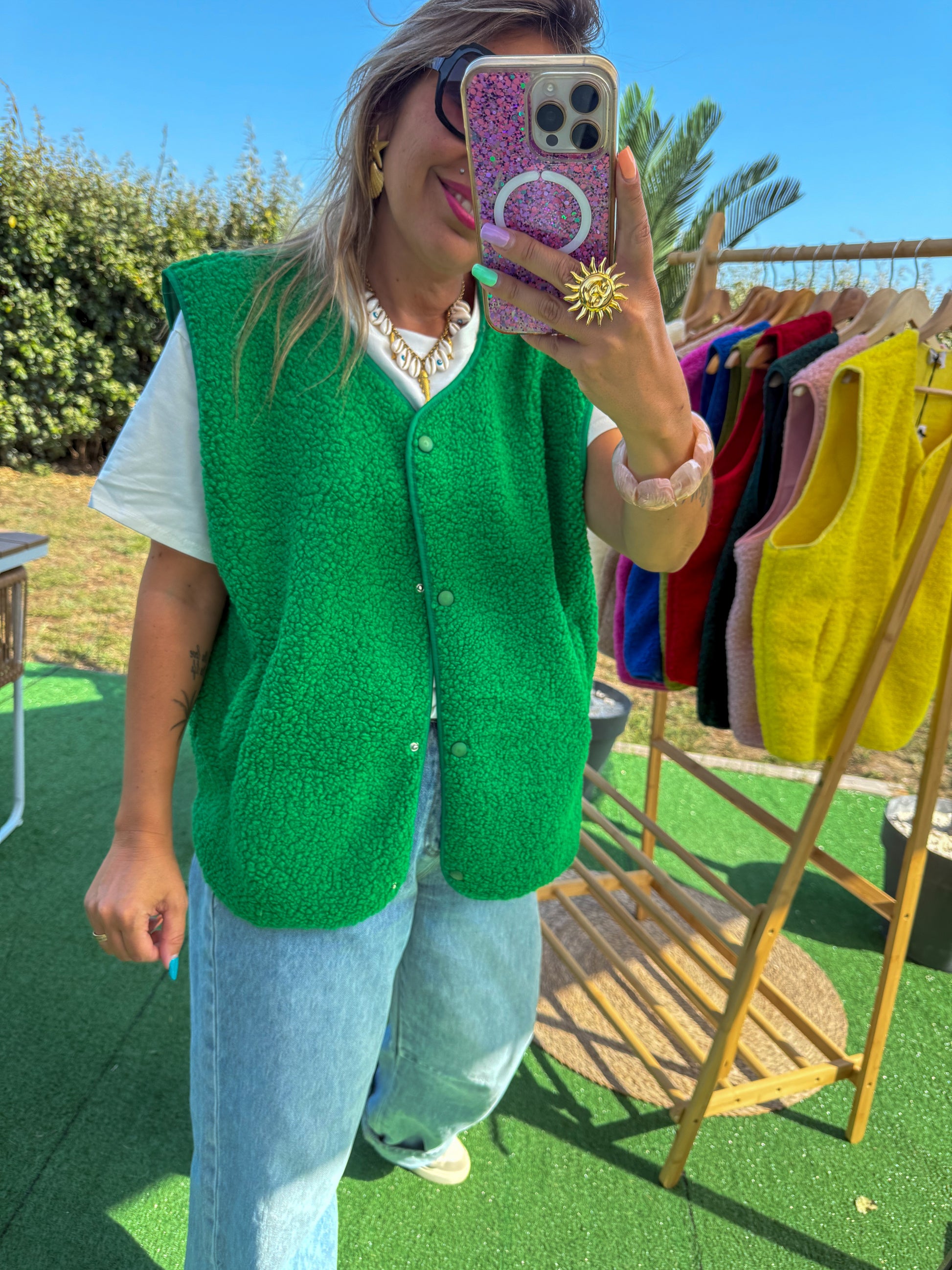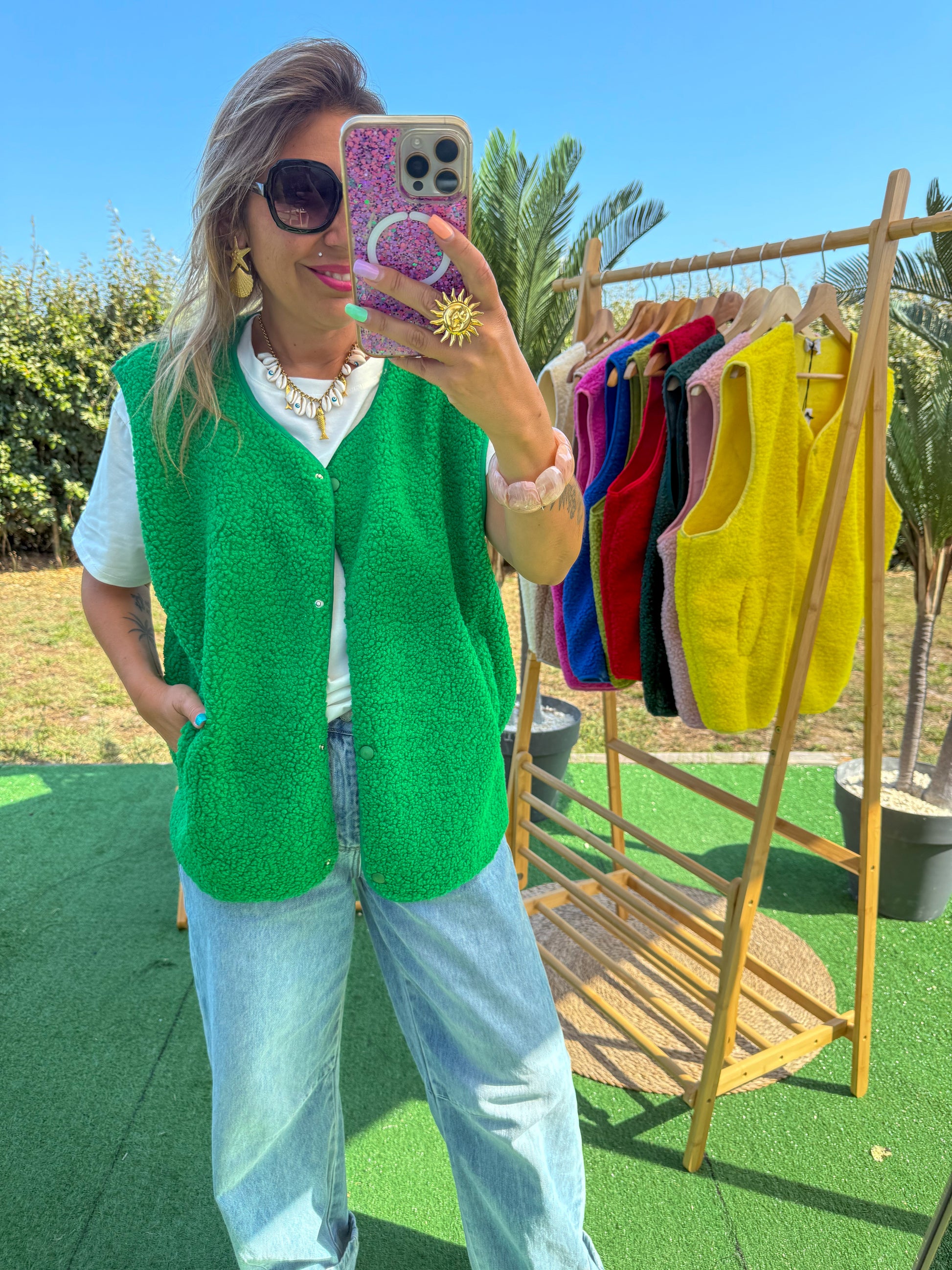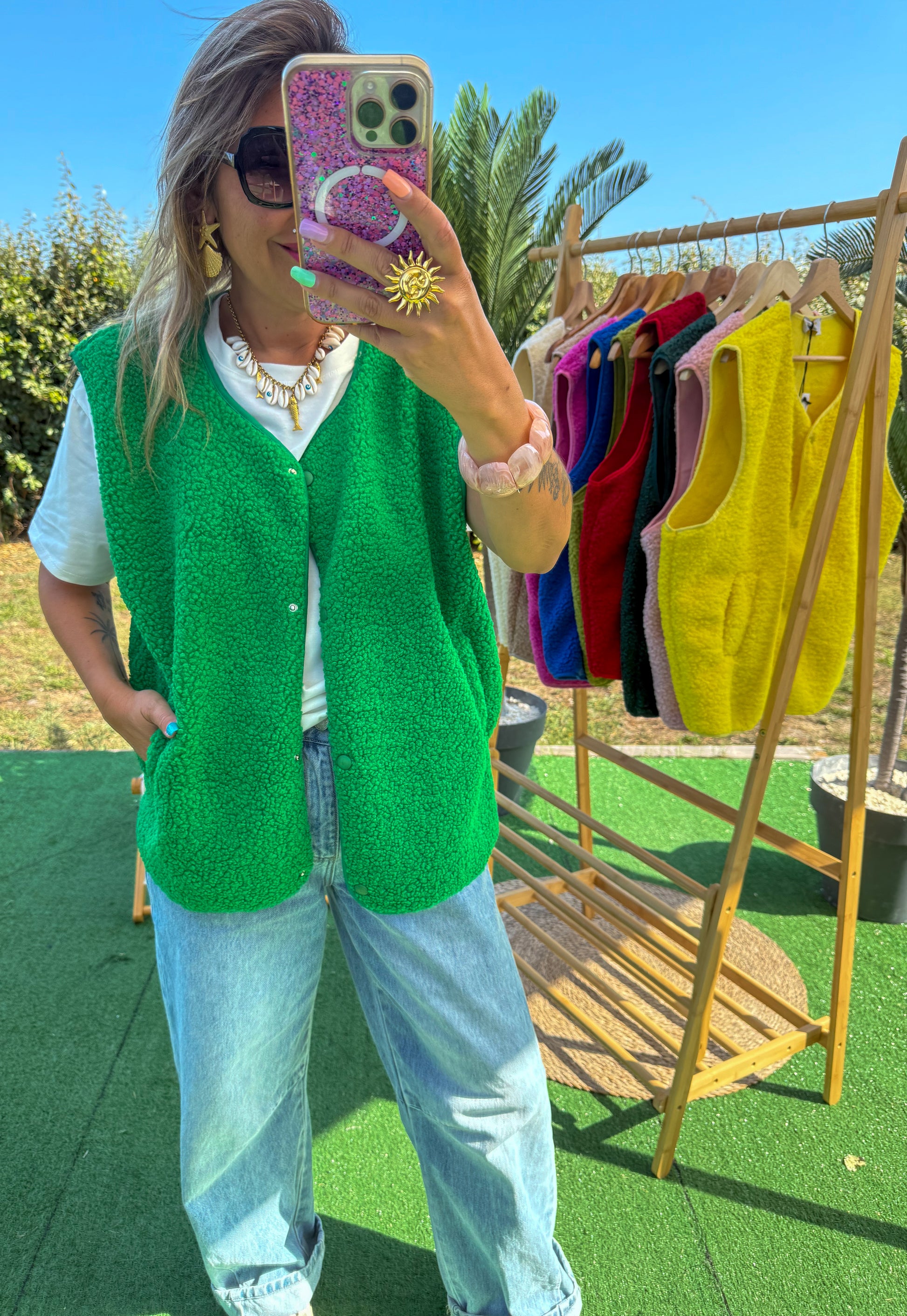 Un indispensable de mi-saison ! Ce gilet sans manches en matière effet teddy ultra douce apporte une touche pop et cosy à toutes vos tenues. On craque pour sa couleur vert Gucci , son col en V et sa coupe légèrement ample, idéale pour un look décontracté mais tendance.