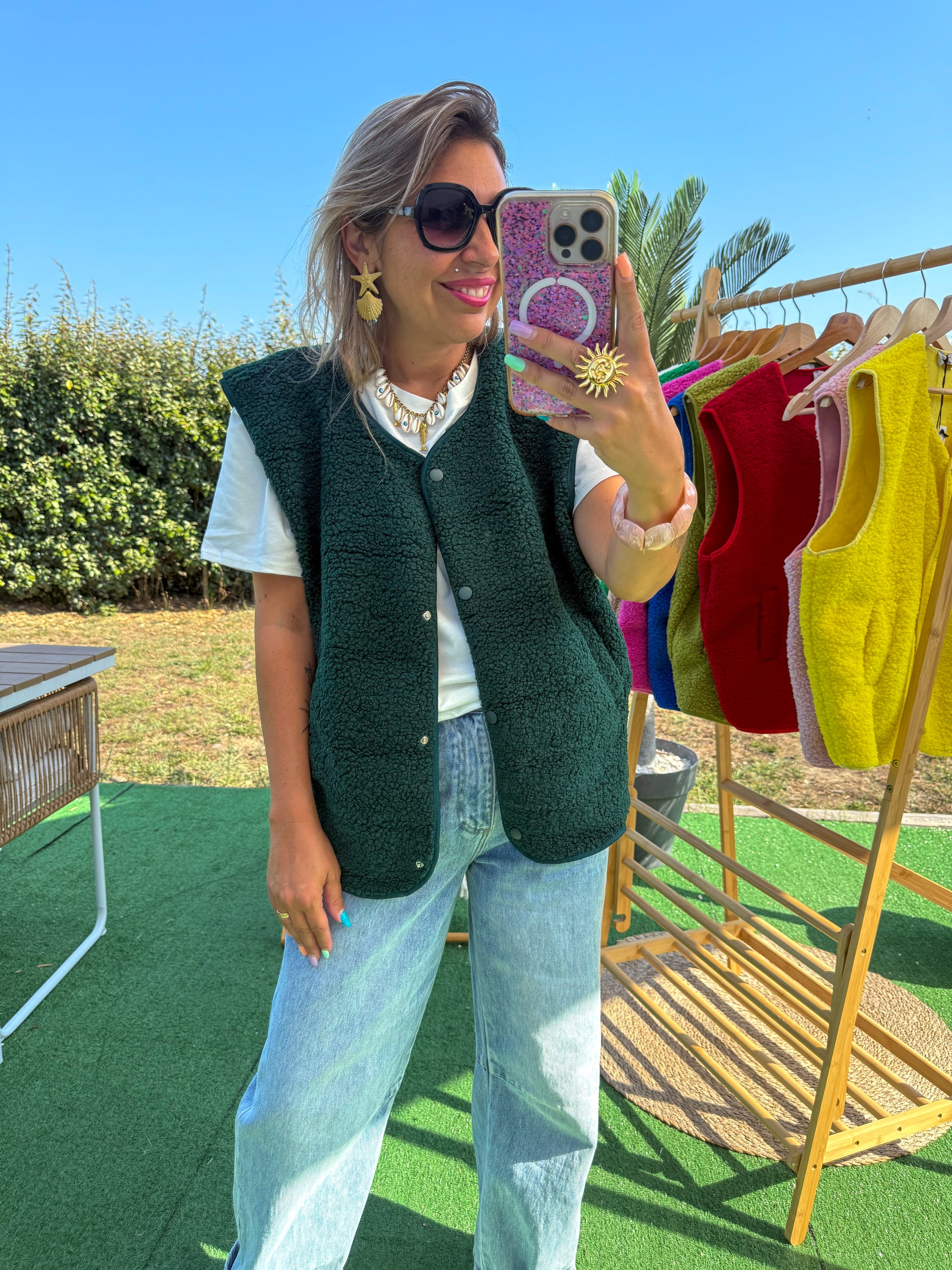Un indispensable de mi-saison ! Ce gilet sans manches en matière effet teddy ultra douce apporte une touche pop et cosy à toutes vos tenues. On craque pour sa couleur vert sapin , son col en V et sa coupe légèrement ample, idéale pour un look décontracté mais tendance.